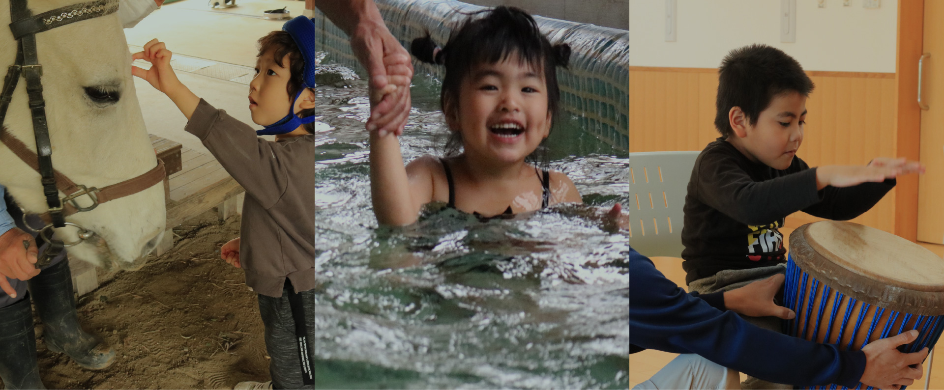 発達がゆるやかな人、障がいを持つ人たちが、心から楽しめる活動を大切にしています。ヨーロッパ各国ではスタンダードな乗馬療法と水治療に音楽療法を加え、1人1人の「できる」を発見し積み重ね、自己肯定感を高めて、自信をつける場所でありたいと思っています。