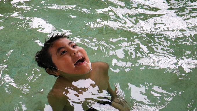重力から解放されるので普段はできない動きができたり、楽に動作ができることで自信やよろこびに繋がります。いつもより晴れやかで楽しそうな表情にたくさん出会うことのできる活動です。